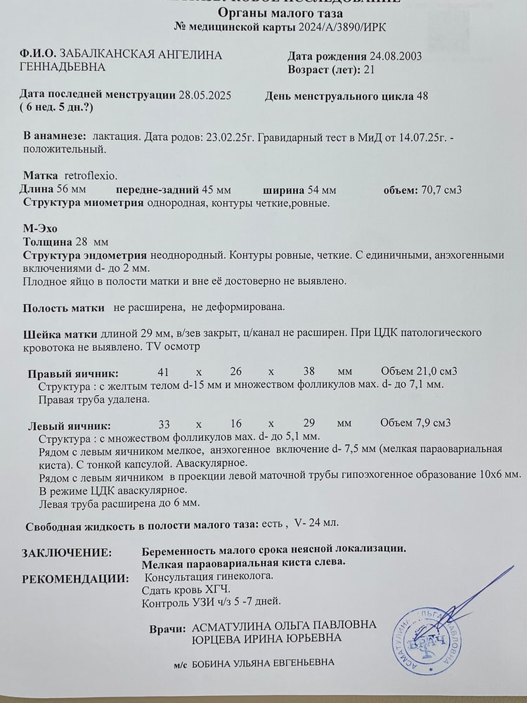 Цикл не восстановился, после родов, дату зачатия не знаю, но врач предположил что сейчас 4-5 неделя акушерская, возможно внематочная в левой трубе, она расширена, может у кого была похожая ситуация как все вышло, в матке есть маленькая точка 2 мм, возможно пя