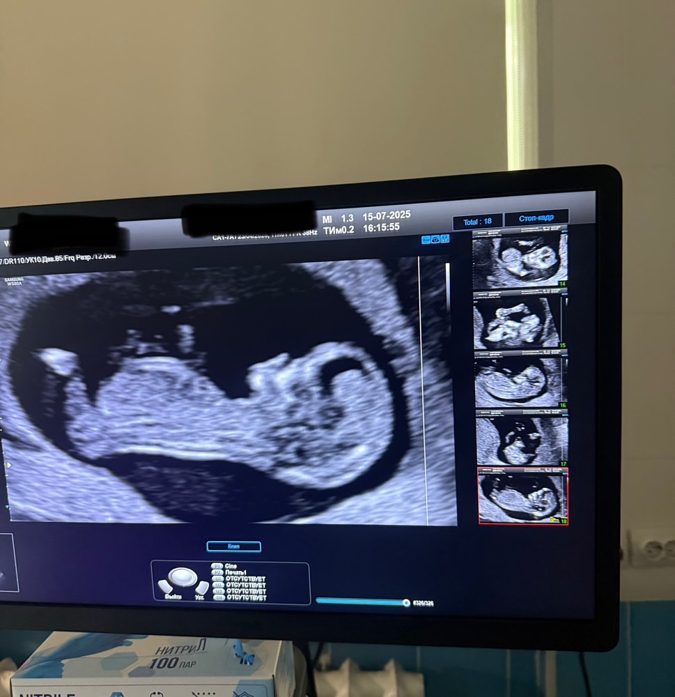 Уже после этого диалога мне стало не по себе и сейчас жалею,что не спросила у нее в чем дело.В тот момент была в своих мыслях,ждала больше всего услышать сердечко.Ведь срок маленький,а за две с половиной недели может многое поменяться.Далее она начала больно вдавливать мне этот датчик в живот и очень внимательно изучать изображение на экране.Все в гробовой тишине...🫠Я уже знатно поднапряглась и только спустя минут 5 она начала диктовать показатели и включила сердцебиение.После всей диагностики мне повернули экран и я уже увидела человечка,который активно двигал ручками и ножками,тянул пальцы в рот.Я аж расчувствовалась,впервые заплакала на узи🥺Мне дали сфотографировать экран(2 фото),тк снимок получился размытым,малыш активно двигался в процессе.Врач сказала,что все в норме и соответствует сроку,но пока рассмотреть внутренние органы трудно.Но я так понимаю,что в заключении(1 фото) она написала,что все на месте и все в норме?Имею ввиду буквы N