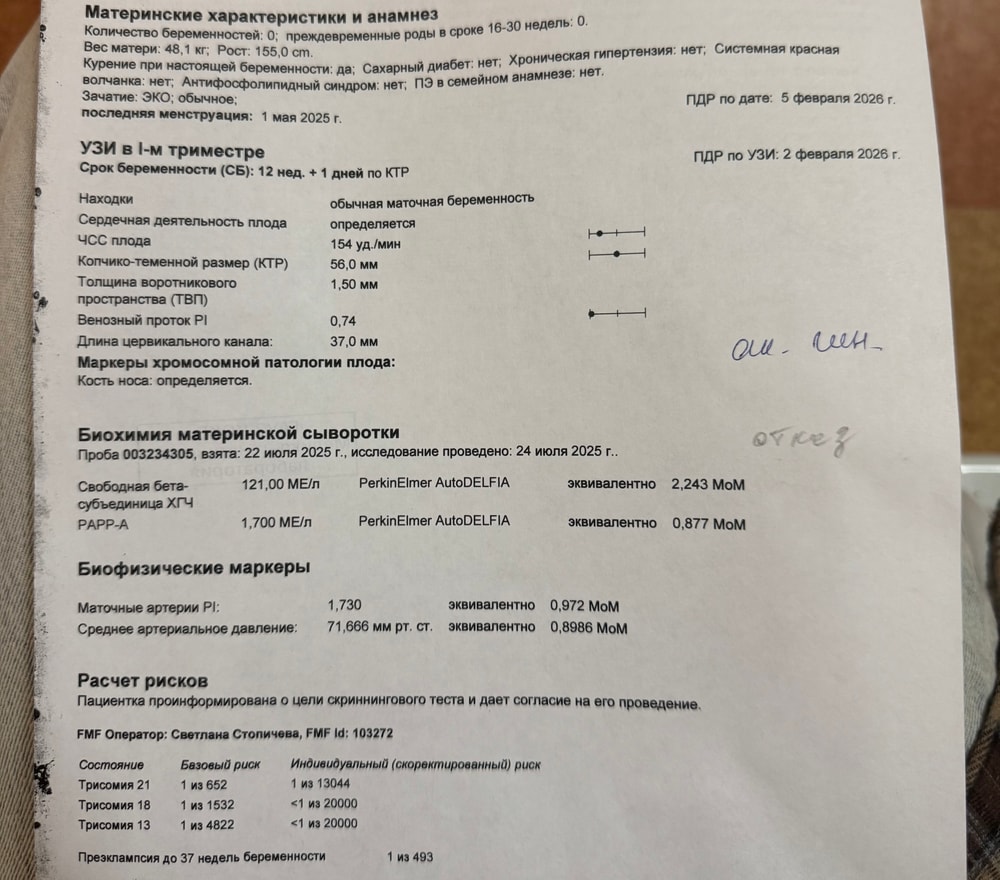 Инна, не надо😁 у меня по первому скринингу вообще преждевременные насчитали и риск СД поставили в серой зоне, хотя у нас вообще генетика была у эмбриона. А риск преждевременных из-за шейки поставили, назначили утрожестан🙏🏻 и всё хорошо! И это еще у меня варикоз вен малого таза, тоже невеселая штука