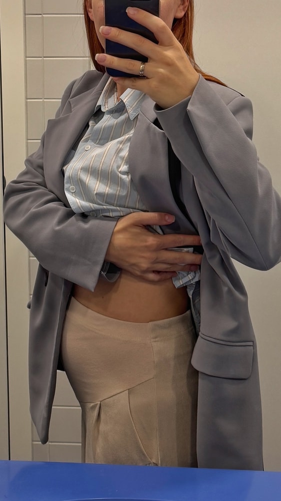 Талия увеличилась уже на 4см, ни в одни свои штаны с комфортом я уже не помещаюсь, все они на высокой посадке, стоя то ещё ничего, но сидя, давят, а после обеда так вообще приходится расстегивать пуговицу😁 На работе дресс код, в алладинах на резинке не гуд ходить, поэтому я купила себе беременную юбку и беременные брюки. Это прикольная тема) И ещё беременные джоггеры с начесом к холодному сезону (джоггеры пока великоваты).