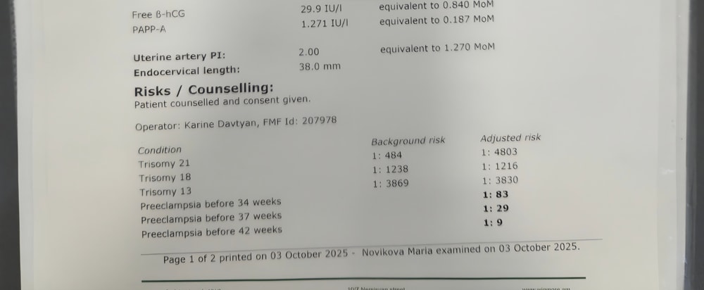 Со старшим были риски 1:21. В итоге тяжёлая преэклампсия и экс на 31 неделе. С младшим риск 1:4. Пкс на 39,3 неделе, все обошлось. В обе беременности пила кардиомагнил. А вот во вторую беременность пила кальций с 14 недели и поливитамины с 1 дня беременности. У подруги примерно тоже самое было. Вот на нашем опыте возникают мысли, что кальций и витамины вытянули, так как помогли нормальному формированию плаценты. Ну это мое мнение