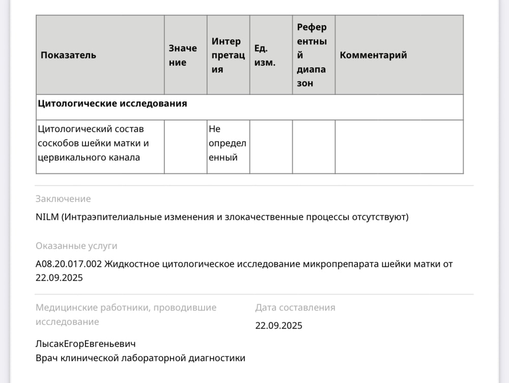 И сегодня пришел на госуслуги результат 🥹🥲 Слава Богу всё хорошо 🙏🏻 снова мой родимый NILM. Да я понимаю, что надо будет сейчас пристально все это наблюдать и после родов я все таки сделаю кольпоскопию через 8 месяцев, так рекомендовала врач на Флотской. Но сейчас я радуюсь тому, что все хорошо. Возможно это был какой то гормональный сбой или еще что то ☺️