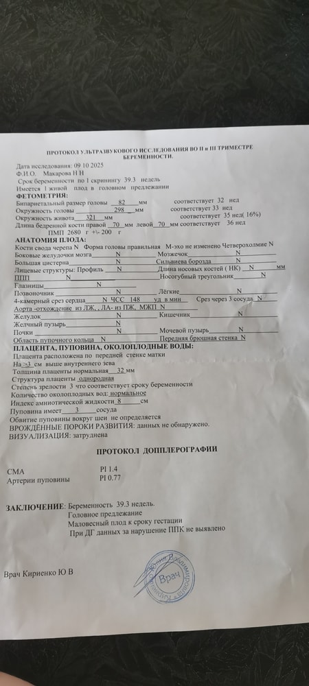 Анализы, скринингиДобрый день всем.Сегодня у меня 39 и 4 срок б,вчера была планово у гинеколога, сделали КТГ. По её словам отслеживалось ктг плохо, на мониторе было написано повторить через 3 часа,что это значит не понятно. Мне было сказано гинекологом уже ложится на госпитализацию в роддом под наблюдение.Я попросила дополнительно чтобы сделали мне внепланово доплер (так как на третьем скрининге были не оч хорошие показателя, отходящие от норм. (прикрепила результат узи фото) Узист тоже сказала что лучше лечь мне уже под наблюдение врачей, возможно сделают родоразрешение досрочное. По первым двум скринигам было все норм, по третьему заключение (СЗРП), по доплер узи (маловесный плод к сроку гистации).Чувствую я себя прекрасно, предвестников пока нет, шевеления ребёнка активные как обычно. Так у меня такой вопрос - обязательно ли мне ложится по рекомендациям всех врачей в роддом? ПДР стоит 13.10, может хотя-бы дождаться дома дня пдр, не очень хочется ложиться и неизвестно сколько вылёживать там.Или лучше с такими диагнозами по узи лечь наблюдаться? Я просто не хочу досрочного родоразрешения, может ещё ребёнок наберёт в весе к самопроизвольным родам? А может быть такое что ошиблись в датах месячных, поэтому несоответствие в весе ребёнка и показателях измерений? Посмотрите пж по фото узи на сколько отстает ребёнок от норм. Я бы легла честно для успокоения, просто старшую дочку(4 года) не с кем оставить, и вот голова кругом. Помогите пожалуйста, подскажите мне..... 🙏🙏🙏