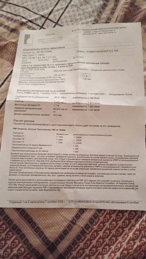 Елена, пришел результат крови , фото прикрепила, там где написано риск расчёта , один риск , ну так врач сказал, ну будут выяснять почему , либо может обойдётся
