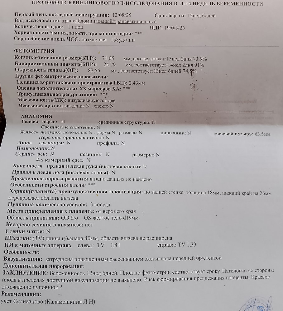 Анализы, скринингиСъездила на первый скрининг, посмотрели малявку) Сказали, что для этого срока все нормально, но пометили себе риск формирования предлежания плаценты и краевое отхождение пуповины. Вроде не паникую, тк прочитала, что все это ещё может измениться, но все равно какая-то тревожность есть, не получается не сравнивать с первой беременностью, когда все было ок без всяких возможных рисков.