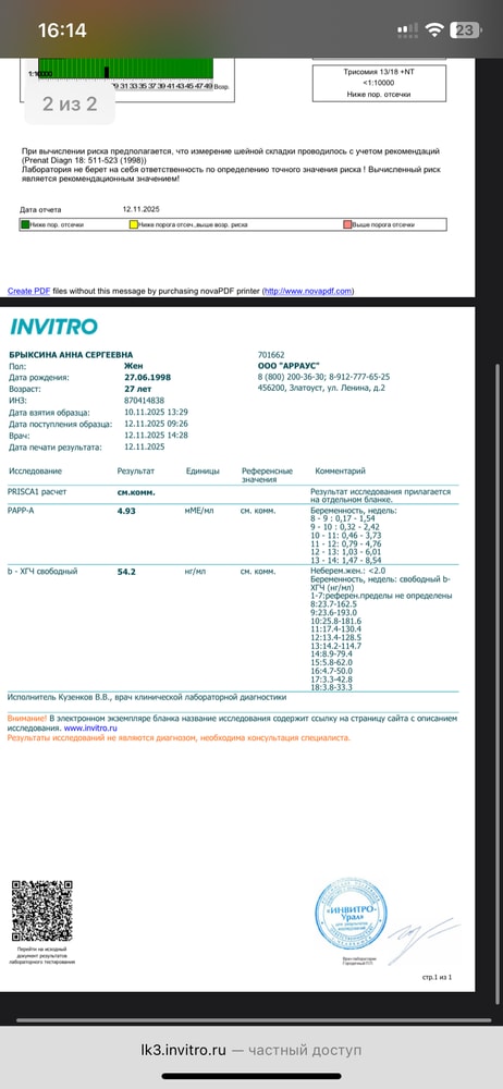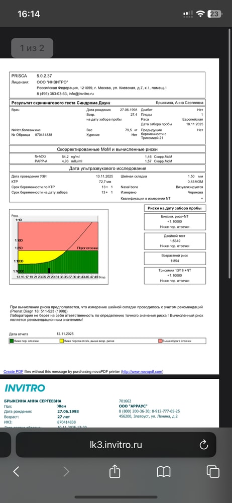 Анна, хотя у Вас там есть еще по трисомиям написано, что риск минимальный, но как-то все в кучу. Не посчитали почему-то риски преэклампсии и ЗРП, но там тоже будут низкие 100%, тк рарр-а очень хороший.
