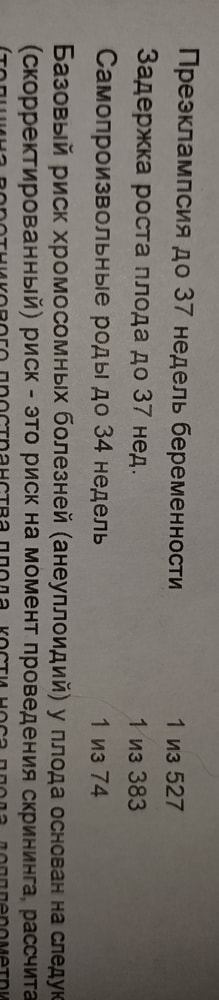 Анализы, скринингиВот такие результаты по крови пришли по 1-ому скринингу. Что-то я только сейчас их увидела. Преэклампсия и ЗРП кажется низкие риски. А вот ранние роды меня пугают?! Может быть этот риск рассчитан чисто из-за анамнеза? (ИЦН в анамнезе), с 6 недель на Утрожестане сижу