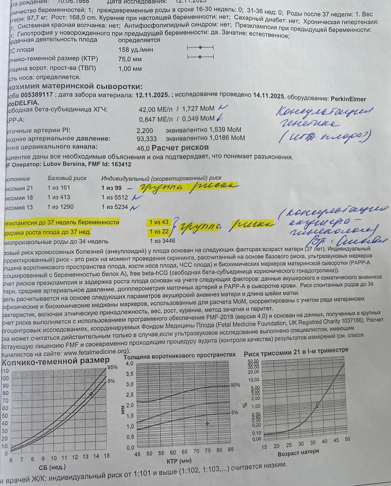 Вы же понимаете да что шанс 1 на 99 это относительно высокий риск по медицинским терминам но по факту это одна женщина из 99 при таких же анализах рожает ребенка с трисомией 21. А 98 рожают здоровых детей.