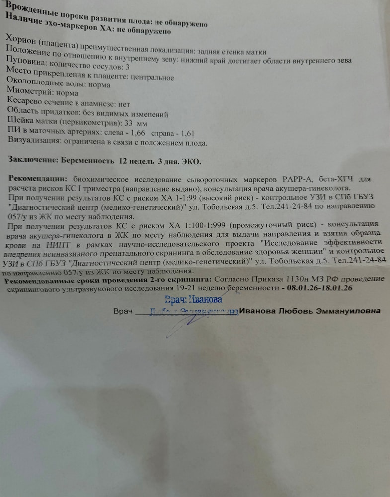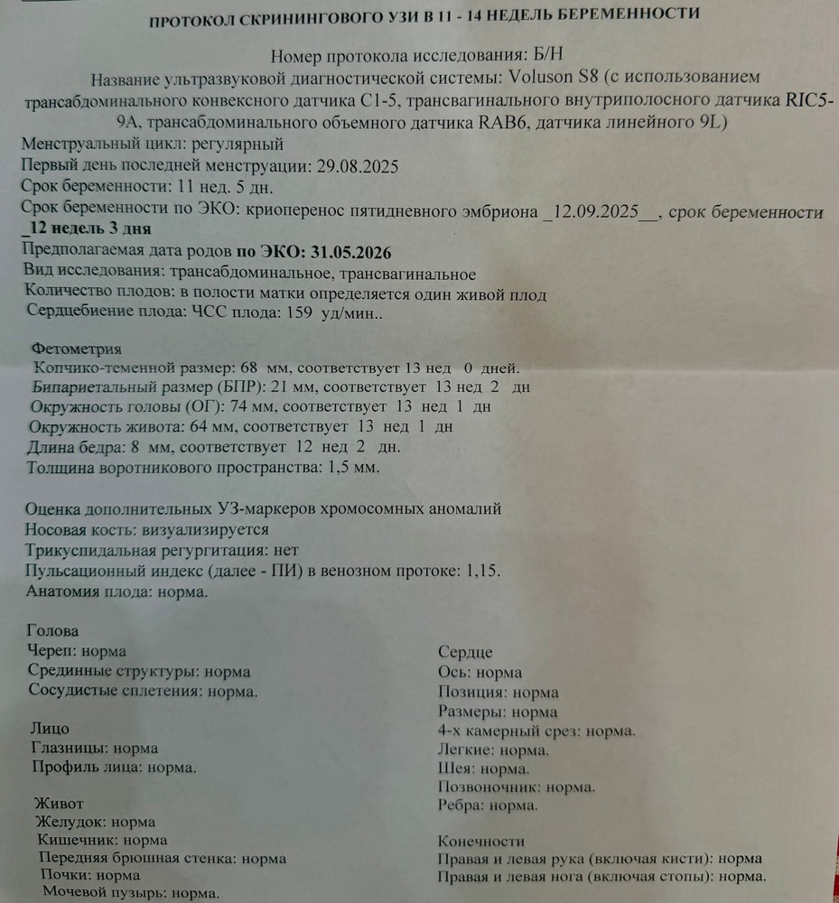 Осмотр в беременность, вопросыВсем привет! Ходили на 1ый скрининг в 12 недель и 3 дня. Прикладываю результаты. Как думаете, надо ли сдавать НИПТ? Беременность в результате ЭКО, крио после ПГТ.