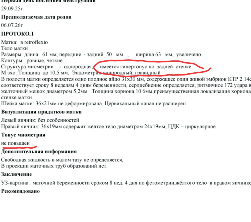 Страхи, переживания и немножечко нытьяДевочки, ничего не понимаю. Шестой день подряд тянет низ живота, срок почти 9 недель. Сходила на узи сегодня, врач сказала переживать не о чем, всё отлично, никакого тонуса нет, а живот тянет, потому что матка растёт, связки растягиваются и всё такое. Успокоилась, пришла домой, стала смотреть заключение узи. А там вот такой результат. Думаю, не станет ведь врач меня успокаивать, говоря, что все отлично, если есть угроза выкидыша? Просто странно, что в заключении разные данные, в одном месте гипертонус, в другом тонус не повышен...как думаете?