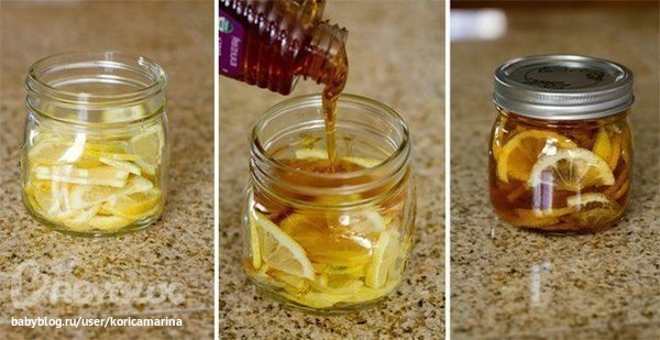 "...нужно нарезать несколько лимонов, залить это все медом и добавить немного имбиря. Закрыть в банке, поставить в холодильник на 2-3 месяца и когда смесь станет желеобразной разбавить ложкой теплой водой – лекарство готово. Если запастись сейчас, то к началу сезона простуд будете готовы.."(рецептик вычитала))