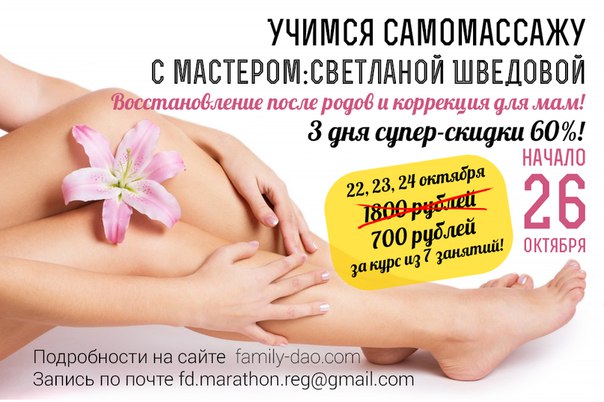 Проект хочет сделать вам подарок и объявляет 3 ДНЯ СКИДКИ на уникальный МАРАФОН САМОМАССАЖА со Светланой Шведовой. ВСЕГО 700р. вместо 1800 за 7 занятий!