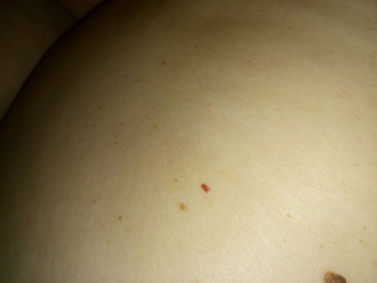 Выглядит как артериальная ангиома. У меня у мужа такое было. Пошел к дерматологу в США. Сказали, что лечения не требует, но для чисто эстетики можно удалить лазером. Удалили. Штук 50 было, больше не появляются, может парочку пропустили.