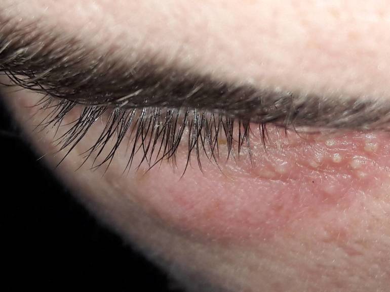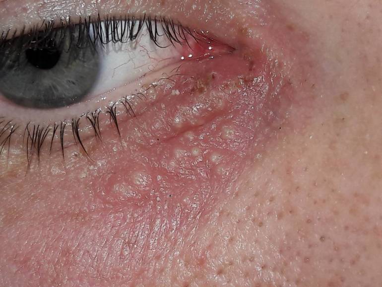 Пошли к окулисту - говорит не знаю, похоже на что-то бактериальное. Скорее всего это к дерматологу, у меня( у окулиста) мама дерматолог, похоже на стрептодермит, помажьте на всякий случай гидрокартизоном(гормональный препарат). Ну и к лору на всякий. У лора сделали снимок - по их части всё ок. Дерматолог посмотрела на расстоянии полуметра особо не приглядываясь. Говорит, возможно аллергический дерматит. Мажьте аквадетримом. Вот такая диагностика у нас в России. Ничего не стали делать, само потихоньку проходит.