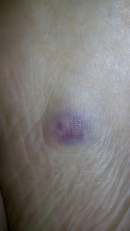Даже и не знаю, это на середине стопы. Уже светлеет, так что думаю, что передавила какой-то капиляр (или что там находится) и он просто лопнул...