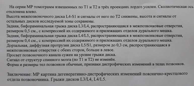 Анализы, исследованияДевочки,знаю,что не по теме..но((Сделав сегодня МРТ просто не ожидала таких результатов(( К врачу записана на завтра,но буду рада советом тех,кто в теме грыж и лордозов.. Напомню,период беременности начались боли в районе тазо-бедренного сустава,редкие но болезненные и только когда наступала на ногу.Говорили,что после родов пройдет..ни фига.Остеопат не помог.Сейчас закончила ГВ,приехала в Москву и должна решить эту проблему.К тому же после начала всяких упражнений на растяжку,боль стала чаще и теперь бывает не только простреливающая,но и ноющая и отдает в колено.Она терпимая и совсем крошечная,но тенденция капец какая не хорошая.Сделала 2 МРТ,тазо-бедренный сустав-нормально все.А вот пояснично-крестцовый: