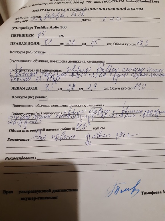 Ат к ттг тоже в норме ?не видно просто ,АТ к рецепторам ттг сдавали ?Узлы у вас больше 1 см?просто почерк не понятный ((если да ,то биопсию назначат.Помимо увеличения ЩЗ,с давлением ,сердцебиением ,весом все в норме ?