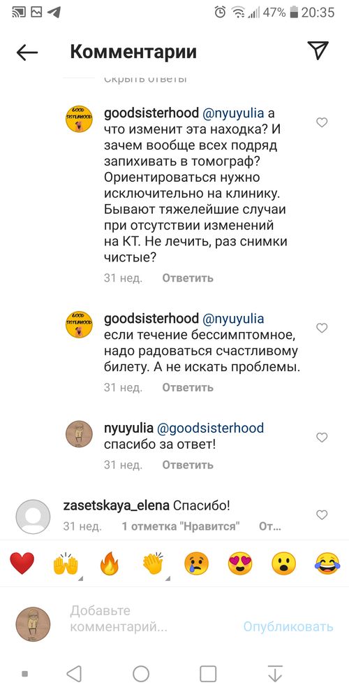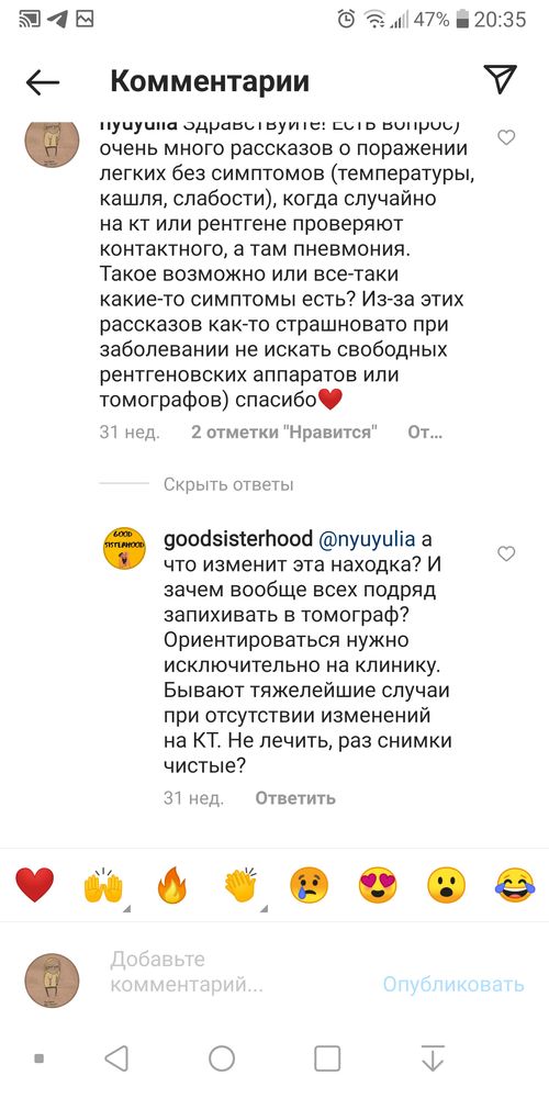 Я забила, жила спокойно, пошла сегодня выписываться из поликлиники, как врач посеяла смуту. Говорит, зря КТ не делаете, регулярно приходят пациенты с полным отсутствием симптомов, но на КТ подтверждается причём большое поражение лёгких и это может плохо кончится.