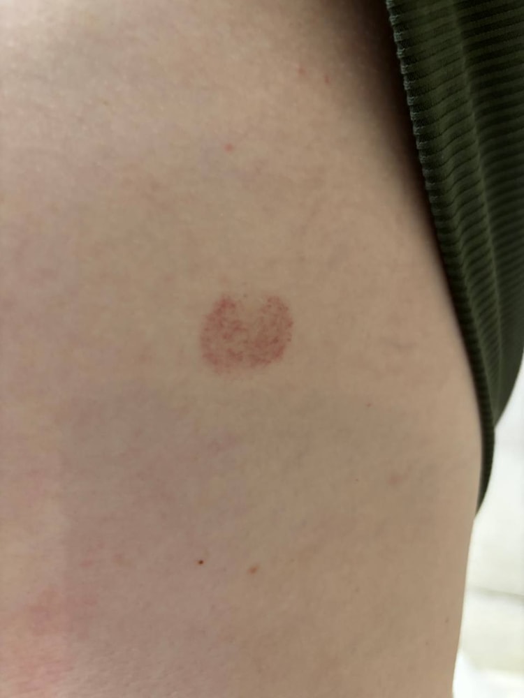 Похоже на гематому. У лишая есть такой четкий кант, более темного цвета, чем остальная часть, юбка такая.