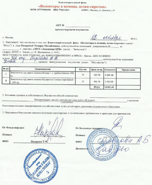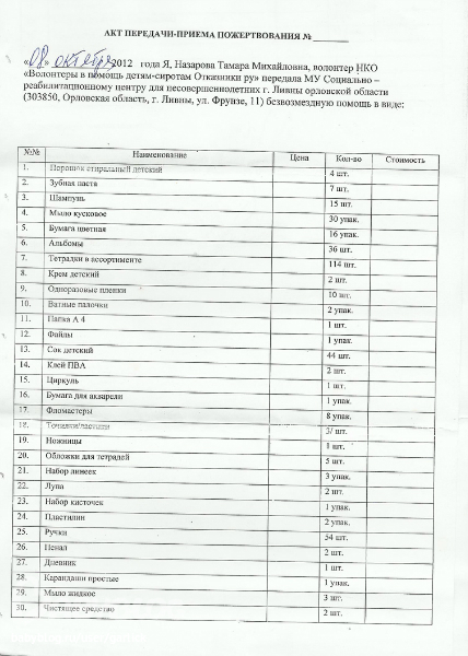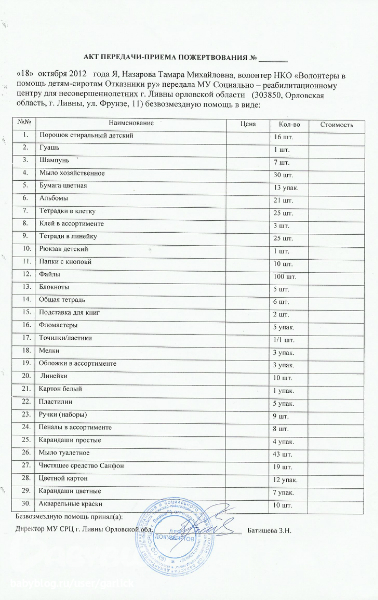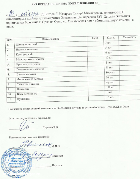 обратите вниманиеДевочки, дорогие ББшки! Выкладываю акты -отчеты о переданной помощи. За осень 2012 года я, благодаря вам передала помощь: