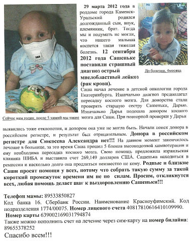 КОПИРУЕМ! ПЕЧАТАЕМ! НЕСЕМ НА РАБОТУ, В МАГАЗИН, НА УЛИЦУ В РУКИ ЛЮДЯМ! ПРОСИМ ПОМОЩИ СРОЧНО!!! Саша, 1 годик, диагноз рак крови. Пересадка костного мозга в Израиле. Срок 1 месяц. Документы, подтверждающие лечение есть. Счет в Сбербанке России 639002169031794874 По всем вопросам 89533850827(мама ребенка)