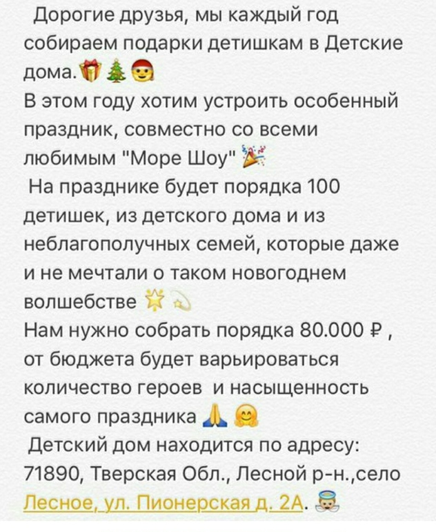 нужна помощь!Добрый день! Мои друзья ежегодно организовывают помощь детским домам, в этом году мы хотим устроить праздник для детишек Тверской области. Если у вас есть возможность помочь, мы будем очень признательны. Любая, даже незначительная сумма, которую вы сможете пожертвовать, поможет провести незабываемый новогодний праздник для детишек.
