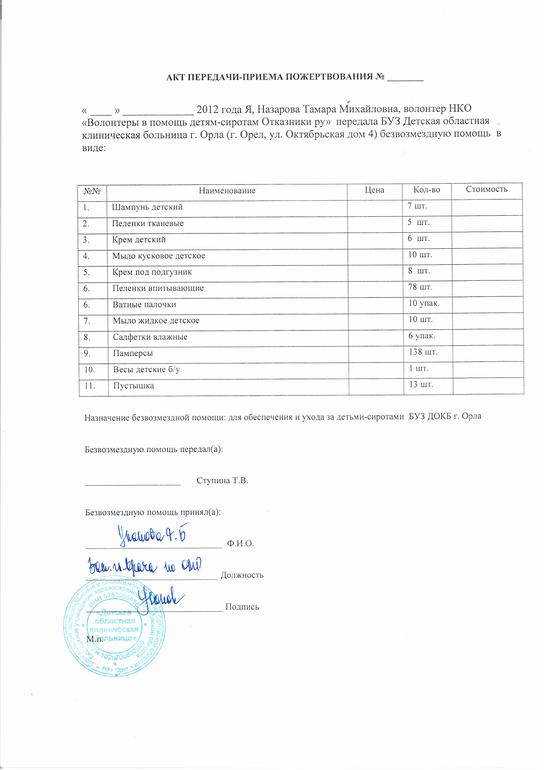 В контакте -клуб орловских волонтеров. Наш фонд помогает тем же отказникам (отказники ру). Бланк акта от нашего фонда, печать ставят у секретаря главного врача или бухгалтерии.