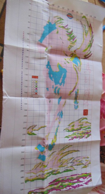 Размер готовой работы 74*52 см. Первый раз вышивала по нанесенной на канву схеме и на 11 канве, так любимой китайцами) Поначалу расстроилась, когда увидела, что схема нанесена на канву, но стала вышивать и мне очень понравилось! Был раньше неудачный опыт вышивки по схеме некитайского набора, больше всего напрягало, что клеточки раскрашены нечетко и иногда не поймешь, каким цветом вышивать. Здесь же все очень четко, по контурам клеточек, цвета хорошо различимы, кроме того, большие области пронумерованы. Вот, например, начало вышивального процесса