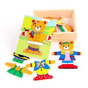 Небольшая коробочка, на крышке пазл из трех частей - голова мишки, туловище и ножки. В коробке еще несколько вариантов одежки, можно менять и складывать как хочешь) Ребенок залипал на эту игру весь день)