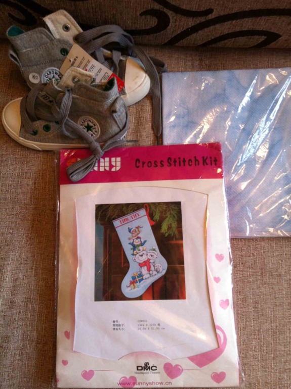 Тут новогодний сапожок, канва с бело-голубыми разводами(очень классная)) и кеды для ребенка) Правда с размером кед я сильно промахнулась, ну ооочень на вырост получается)))
