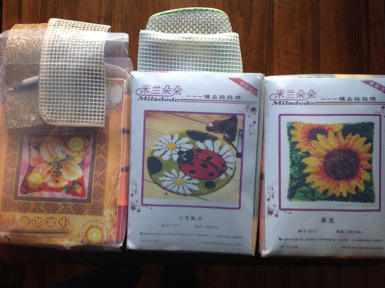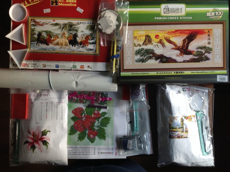 Получила три набора в ковровой технике, три набора + подарочек от Марии в алмазной технике и красивейший набор для вышивания Парящий орёл и Табун лошадей. И приятные подарочки, опять же от Марии: карандаш, тарелочки для алмазной техники, нож для резки бумаги и картонные бобинки для мулине с круглым ДМСишным держателем. Здорово, что подушки в ковровой технике все с наволочками, даже круглый коврик с прокладкой и краевой обработкой. СПАСИБО, Мария!!!!!