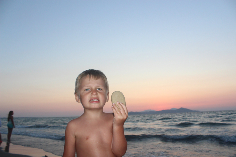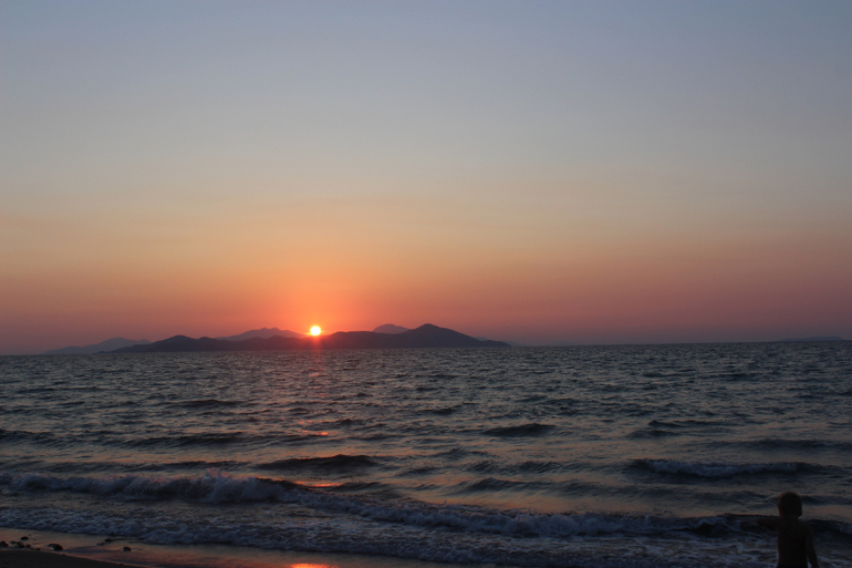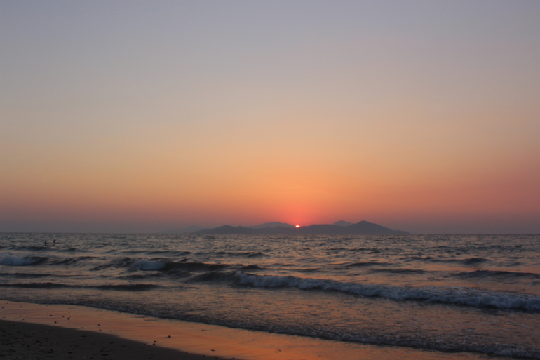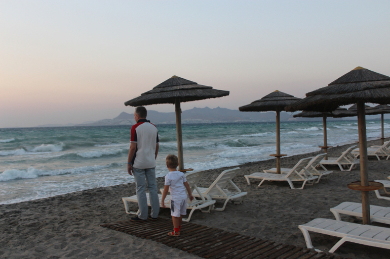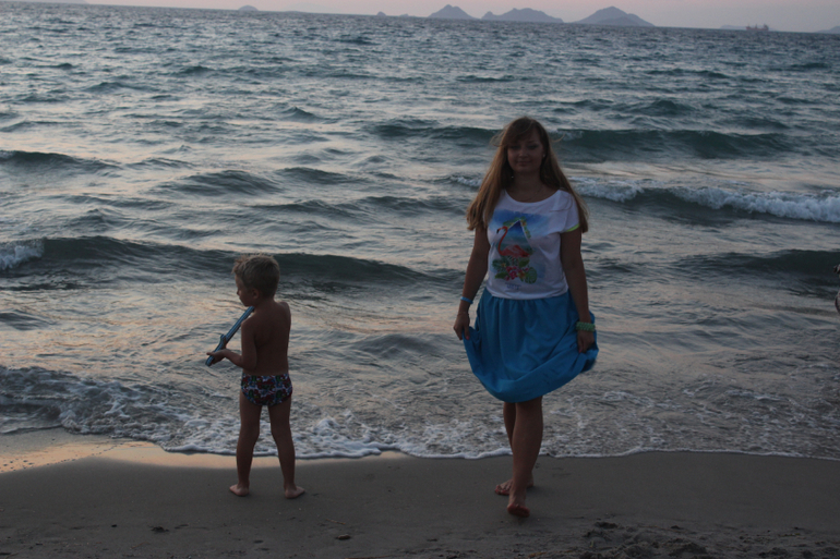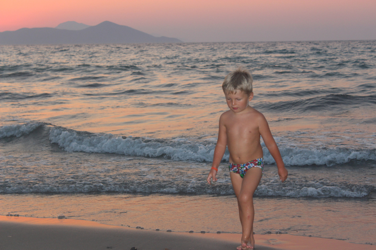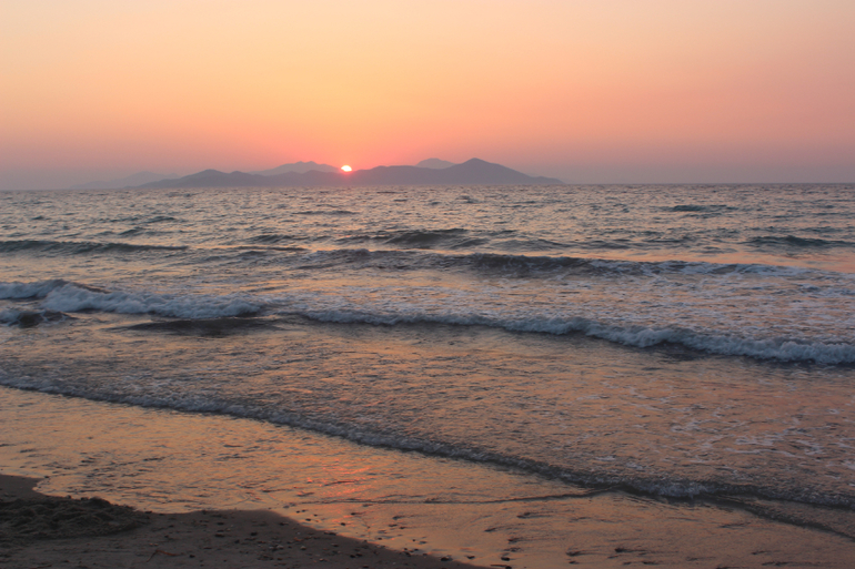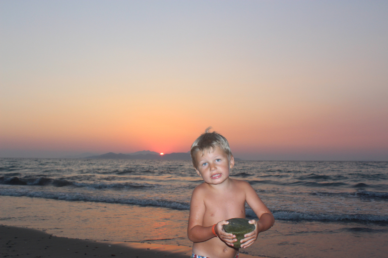 Море! О как же меня поразило море в этом месте. Это что-то волшебное, неземное, это действительно живое существо. Нигде я так не влюблялась в море, как здесь (хотя была в Греции и раньше - на Крите, была и в Тайланде, была на Кипре, в Израиле, про Турцию и Египет молчу...). Пожалуй, только море у берегов Крыма может сравниться по красоте с морем Коса. В первый день море было штормовым, с виду очень грозным, волны бросались на берег яростно, будто мстили за его спокойствие и безмятежность. Но стоило только коснуться босыми ногами воды и все, иллюзия агрессии развеивалась, рассеивалась на этом сильном, но ласковом греческом ветру. Такими теплыми были эти воды сурового внешне моря, такими нежными и ласковыми. "Милые," - сказал про них мой сын. Они действительно милые, точнее не скажешь. А какие закаты над этим морем! Боже, я позавидовала людям, которые по-настоящему умеют рисовать. "Почему я не Айвазовский," - тоскуя, вопрошала я мужа. Мы были на северном берегу острова, вдалеке на горизонте виден берег Турции, слева еще несколько островов, над ними и садилось солнце. К сожалению, и фотограф я начинающий, точнее, едва начавший, и передать всю красоту заката на фото не смогла, но очень старалась)))