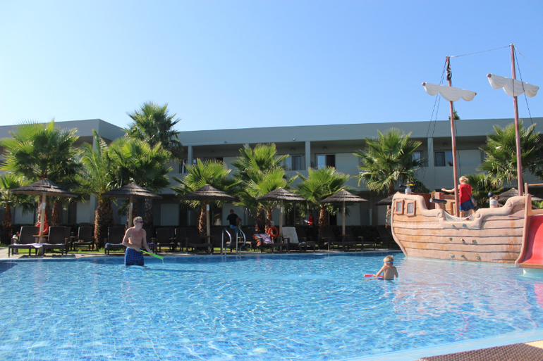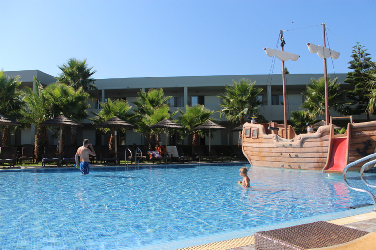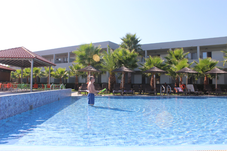 Сам номер симпатичный. Две кровати рядом и одна отдельно у стеночки. Телевизор, минибар (в нем одинокие три бутылки воды, которые, кстати, не приносятся больше, а воду, как объяснила нам потом гид на встрече в эти бутылочки нужно наливать самостоятельно в любом ресторане или баре, удивило, но не более... Неудобства в этом не было), кондиционер, шкаф, все как полагается))) Сейф есть, но он закрыт, ключ нужно оплачивать на ресепшн. Причем, судя по конструкции сейфа, это реально КЛЮЧ, т.е. железяка. Стоимость не помню, но меня сам факт ключа (а не кода, как обычно) несколько напряг, т.к. я бы его обязательно потеряла, поэтому мы решили рискнуть (как гид сказала, воровства в отеле нет, поэтому наверное риск был небольшим) и хранить все без сейфа. Большой балкон (как я поняла, на первом этаже балконы раза в два больше, чем на этажах выше), на балконе стол и два стульчика. Все очень мило. Курить на балконе можно. Да и вообще в Греции курят везде, как я поняла...