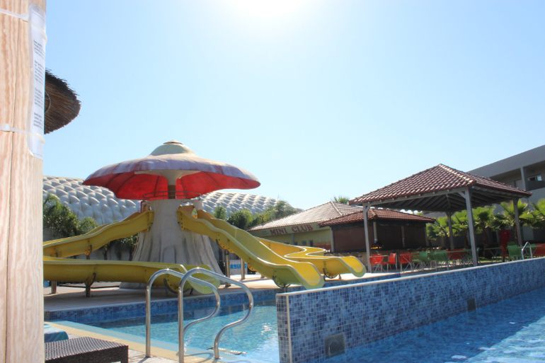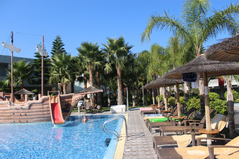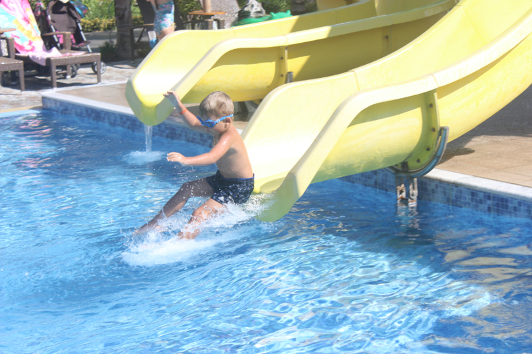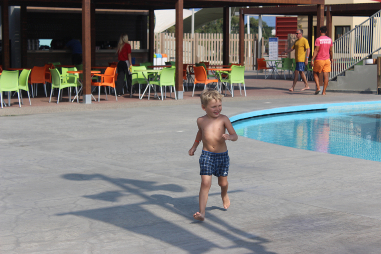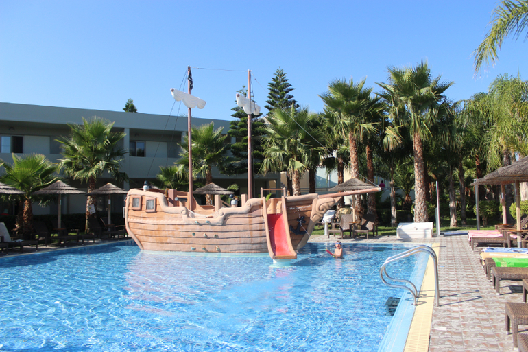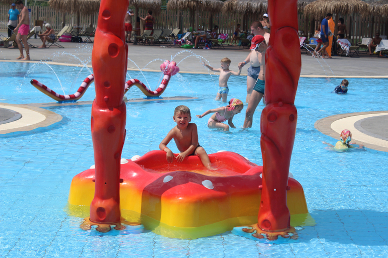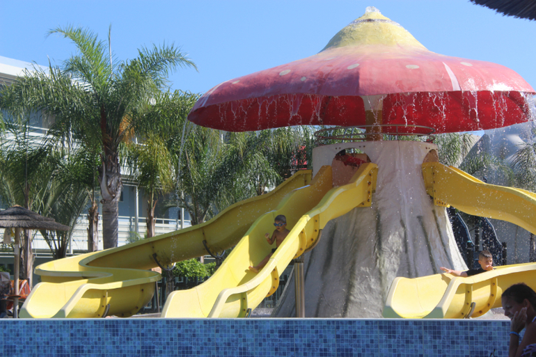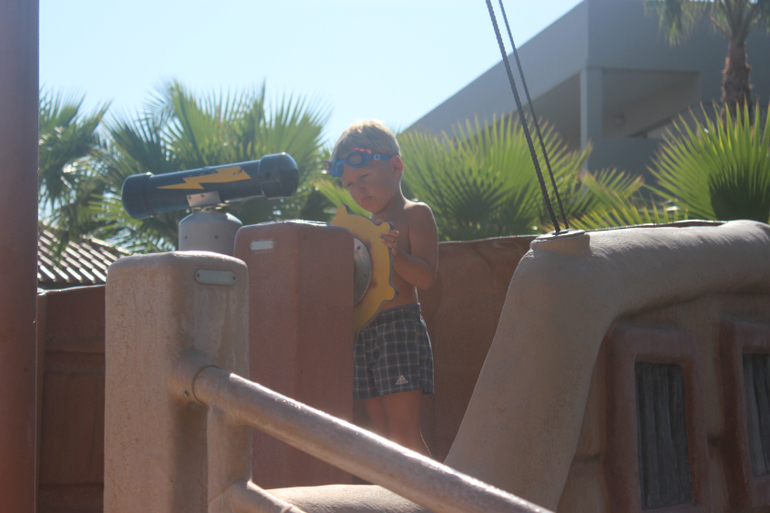 Про бассейны. Мы были только в детском бассейне и в аквапарке. В детском бассейне очень здорово именно для деток 3-7 лет. Одна половина бассейна глубиной 60 см, другая - 90. То, что надо) В половине помельче стоит корабль пиратский, из которого, как из фонтана бьет вода, на другой половине три горки. Надо сказать, что хорошая горка только та, что посередине, по ней детки действительно едут, а вот по крайним они ползут, а нижнюю треть горок преодолевают, исключительно отталкиваясь руками, т.к. они очень пологие, а напор воды слабенький. Вставать на этих горках не дает строгий LifeGuard, который сидит в непосредственной близости и примерно раз в 15 мин раздается его свист)))