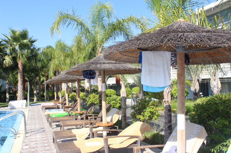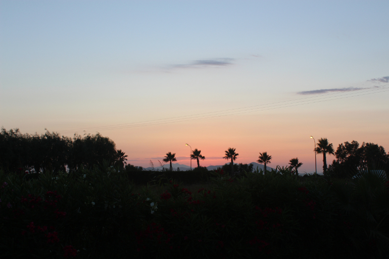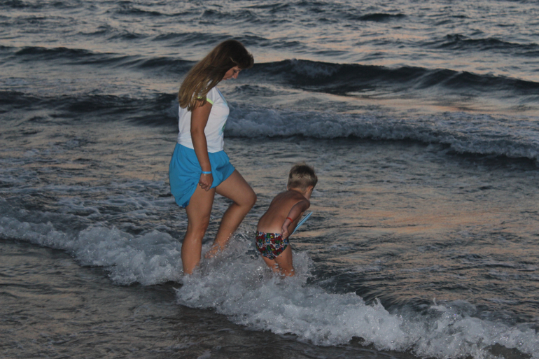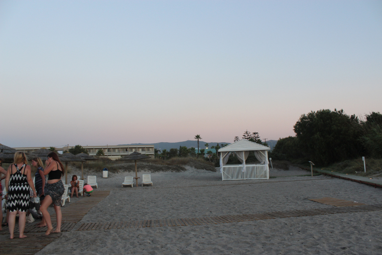 Пляж городской, имеет голубой флаг. От отеля до пляжа идти метров 200, предварительно нужно перейти дорогу, но она не слишком оживленная. На пути от отеля до пляжа стоят кабинки с туалетами и раковинами, очень удобно. Лежаки платные. 5 евро за два лежака и зонтик в день. Пляж работает до 6 вечера. Мы ходили после шести))) И ни за что не платили, правда, на лежаках не лежали))) Море после шести становится каким-то совершенно волшебным, еще более ласковым) Оно очень теплое!!! В общем, мы купались на закате)))