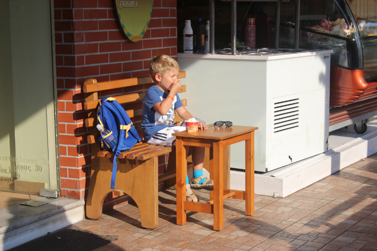Съездили мы в столицу острова - город Кос. Тим кушает мороженое в местной булочной))))
