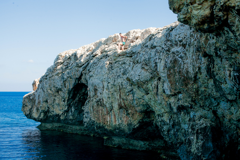 Вот там какой-то человек в зеленых плавках слился со скалой и собирается сигануть вниз...прыгал красиво!)))