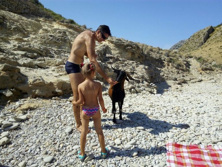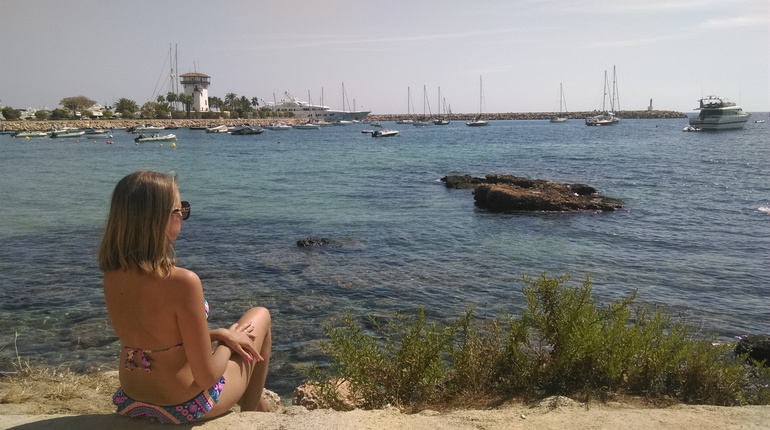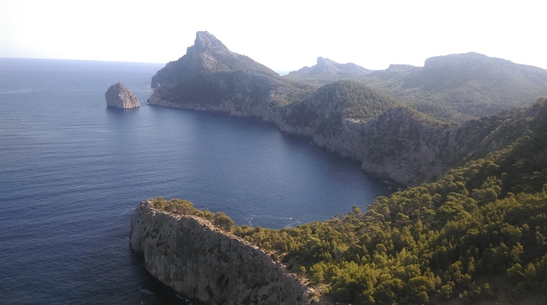 На следующий день, встав пораньше, мы направились на север острова мыс Форментор. Красота необыкновенная-горы,сосны,воздух. Мы приехали пораньше, народу было не много. Затем мы как горные козлики решили по скалам спуститься у дикому пляжу. Пляж оказался не очень, но в гости к нам пришел местный житель и, порывшись в наших сумках, съел все печенье))). На обратном пути мы заехали в Алькудию, покупались-позагорали-покушали.