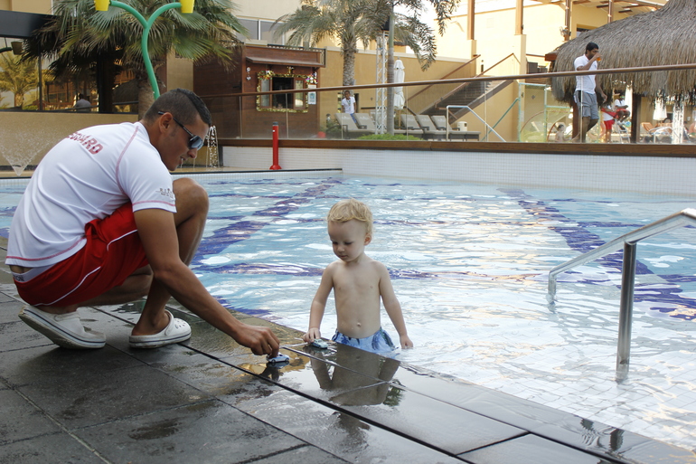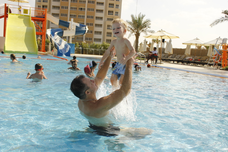 сам отель : бассейны отличные , есть с горками он с подогревом и детский тоже теплый и есть горочка и мини площадка с фонтанчиками , взрослый трех ступенчатый большой , есть ворота где мои любили играть в водный футбол , мячи выдавали по номеру комнаты бесплатно