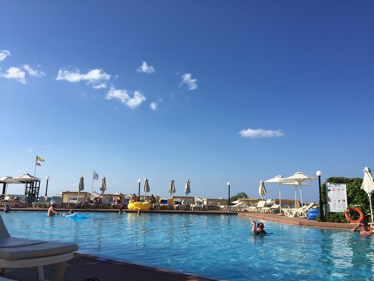 Плюсы отеля - современный (видимо, после ремонта), кормят вкусно, можно выбрать любой тип питания, в том числе и "все включено". От моря - минута, точнее он прям на море. В самом центре города (а для нас это тоже плюс). Не для малышей, хотя с детьми народ, конечно, тоже был, но все же публика взрослая или молодежь или с детками постарше.