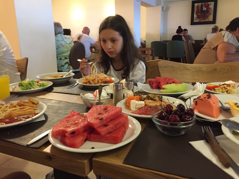 Кормили отлично. Ну, опять же что считать отличным. Как в Испании каждый день морепродукты и каждый день разные? (и это было в трешке!) тут такого, конечно, не было. Но, выбор достаточно большой, все вкусно. Голодными точно не ходили и иногда что-то брали с собой. Не вижу в этом ничего плохого, особенно, когда отдыхаешь с ребенком и ей то одно хочется, то другое. Обедали мы в номере фруктами, которые брали с собой (киви наше все) и рядом было куча супермаркетов. А девочки мои - обжорки и гурманы)))) И ходили постоянно на обед в ближайшие кафешки. Если бы мы хотели кушать (но, на жаре вообще не хотелось), то тоже бы ходили. Но, мы очень наедались на завтраках.