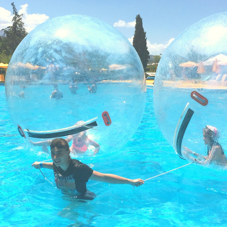 Выходите из отеля и налево, идти минут 10. Вход туда бесплатный (многие думают, что платно). Но, именно горки (они больше для взрослых или подростков) 8 евро в день. Все остальное (бессейны, в том числе с малышковыми горками) бесплатно! Лежак - 3 евро всего...везде на море-пляже-бассейне по 8) Из трех-четырех раз, что мы там были к нам подошли всего один раз и попросили заплатить, а в первые дни реально мы сами ходили искали кому заплатить, но так и не поняли. Нарвались на одного уборщика, который кроме греческого ничего не понимал.