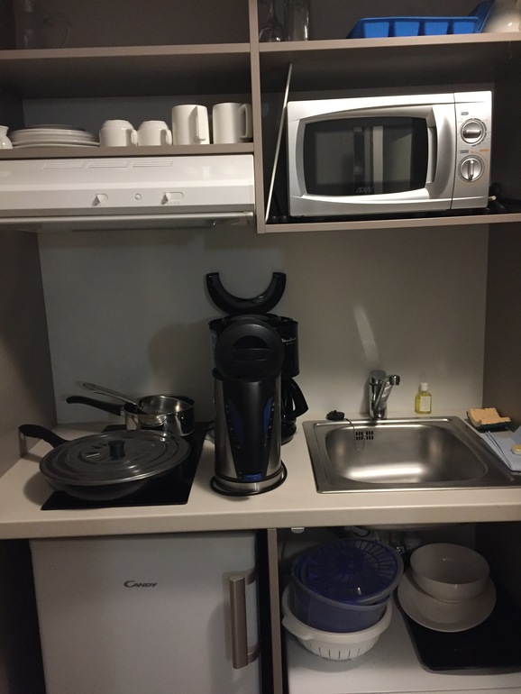 Единственный минус - в стоимость не входили завтраки, но там это обычная практика. Это апарт-отель, с мини кухней, на которой есть все необходимое - плита, микроволновка, чайник, кофеварка, холодильник, посудомойка. Завтраки по 12 евро, что все же было дороговато, учитывая, что в шаговой доступности много кафешек со свежими круассанами за евро и душистым кофе. Плюс рядом находится Ашан, где тоже всегда можно было что-то купить на завтрак.