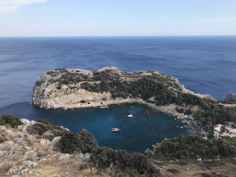 От отеля можно пешком дойти до бухты Энтони Куина. Можно идти по дороге, по которой едут машины -это долго и не интересно, а можно через горы, по тропе монахов. Мы выбрали второй вариант, виды потрясающие