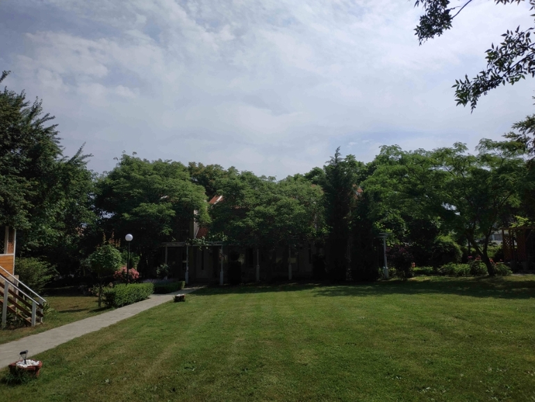 Детская площадка с интересным домиком-беседкой, очень ухоженная чистейшая территория с зеленой травой (ежедневный полив), высокие создающие тень деревья, фруктовый сад с лавандовой грядой, кухня с плитой и духовкой - при желании можно готовить любые блюда, чистые санузлы для тех, кто останавливается с фургончиком или на машине с палаткой, стиральная машина, великолепный розовый сад, три стола (один в беседке, где я пишу этот пост, два в помещении кухни), wi-fi на всей территории (работаю лежа под розовым кустом), паркинг. Хожу босиком. Честно - могу не ходить на море, а потянуться-почитать-поработать здесь и прокатиться в горы на машине. Самый крутой показатель.