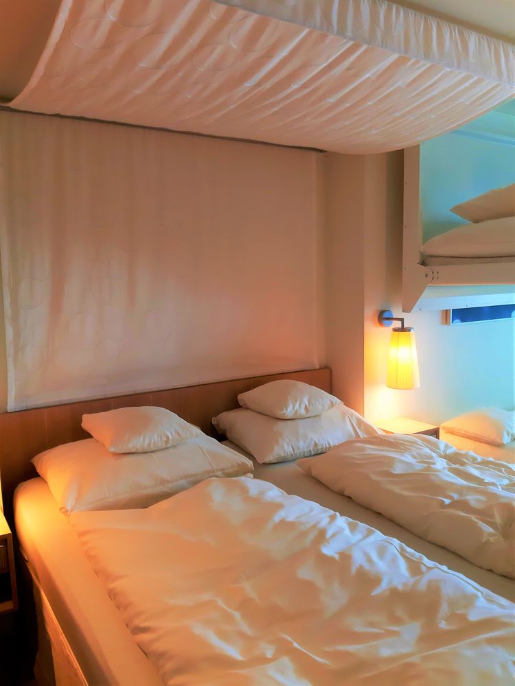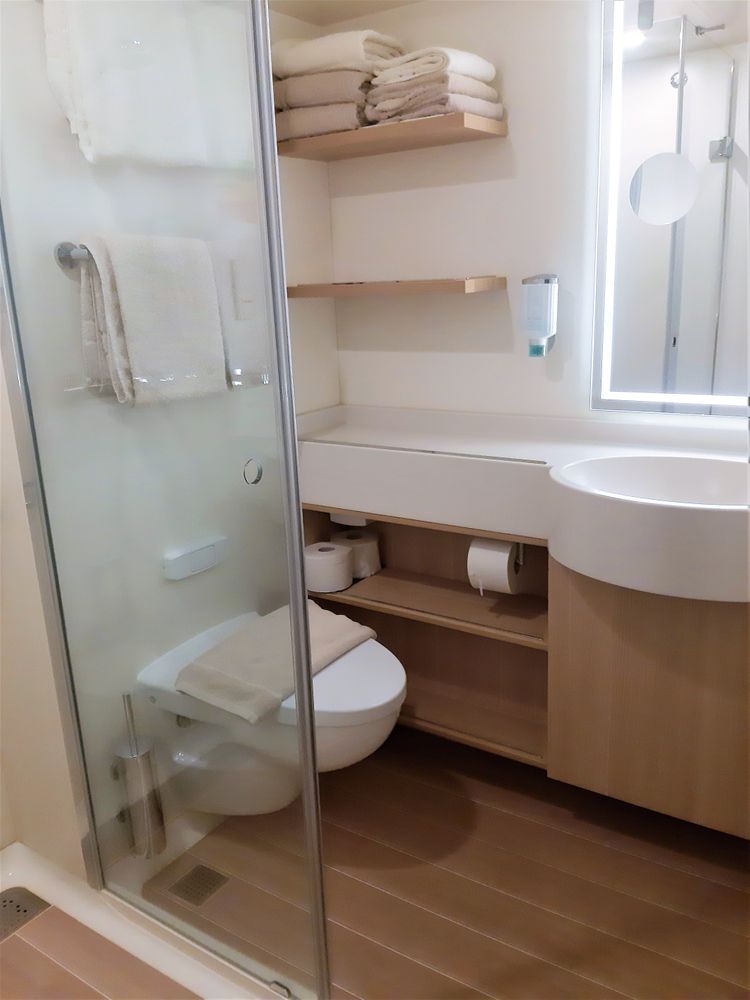 Аида Нова - лайнер от немецкой круизной компании. Новый, на тот момент ему был всего лишь год в эксплуатации. На борту все по-немецки: язык, точность, пунктуальность, четкость. Быстрое оформление, выдача бейджей для каждого проживающего, определение каюты и мы на борту. Вся эта рутина ничуть не притупила ощущение торжества, праздника, пышности и роскоши, которыми окружает этот лайнер сразу. Он огромен и прекрасен. Благодаря Кэтти Путешественница мы воспользовались каютой на 5 человек. В каюте свой довольно просторный санузел,