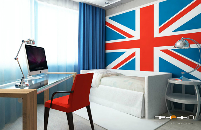 Проект, о котором мне хочется рассказать на этот раз, получился очень необычным. Это - комната для 17-летней девушки, которая без ума от всего, что связано с Великобританией. Собственно, это становится понятным по первой картинке: огромному, во всю стену, нарисованному британскому флагу. :)