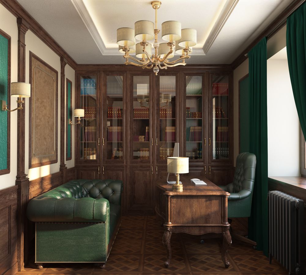 Стильный дизайн проект интерьера кабинета в загородном доме в классическом стиле. Разработанный и реализованный дизайн студией интерьеров Артпланнер.