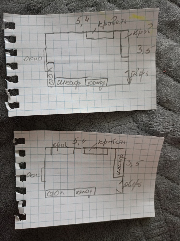 Помогите сделать расстановку комнаты, детям(1 год и 5 лет), но сразу предусмотреть место для столов.лучше кровати поближе ставить или подальше к друг другу? Шкафов нужно много, гардеробных и кладовок нет. Комната 5.4х3.5