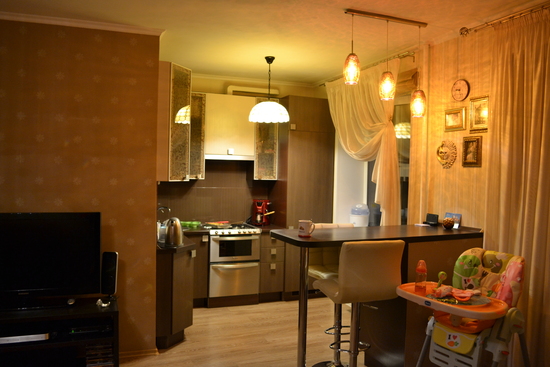ну вы молодцы столько впихнули,ещё и трубу перенесли!))ещё мне шторы ваши понравились,что это за материал?Лиля,а у вас стол есть обеденный или вы только за стойкой едите?
